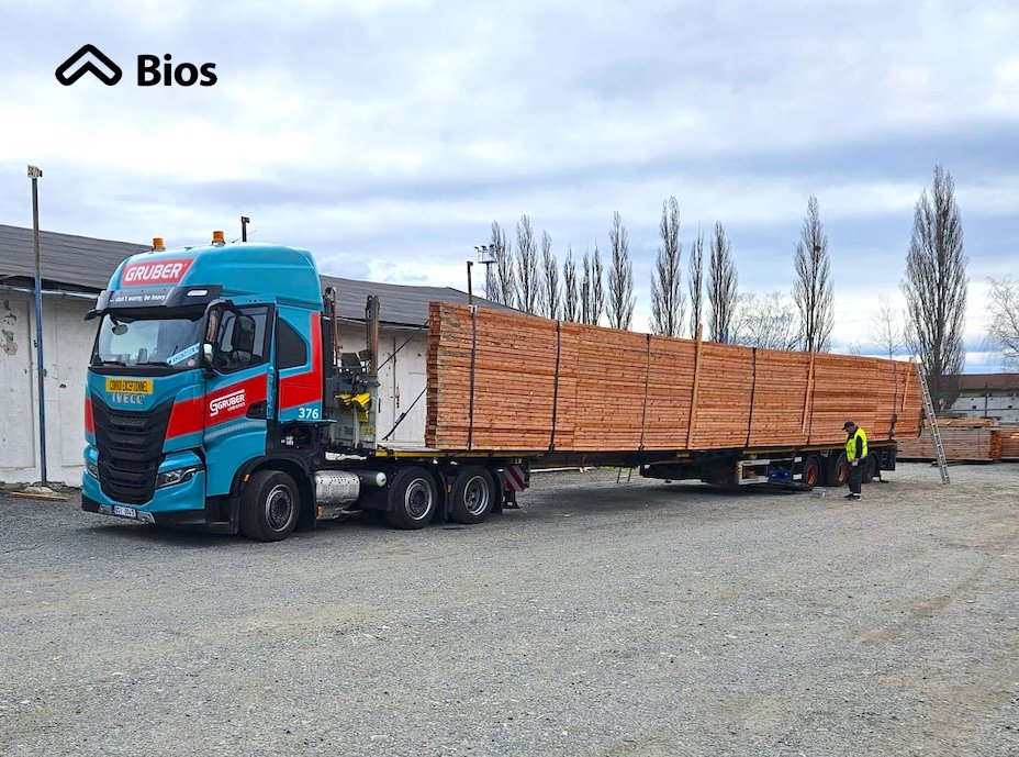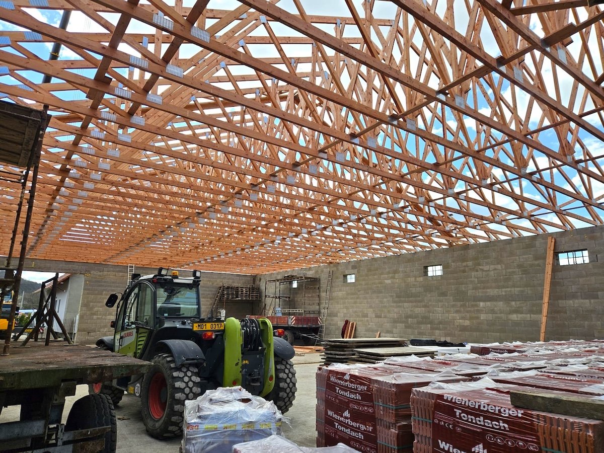 Jsme jedni z mála v širokém okolí, kdo dokáže takto vysoké dřevěné vazníky vyrobit v jednom kuse bez nutnosti dělení. Díky tomu jsme mohli zachovat maximální pevnost a stabilitu celé konstrukce. Výroba vazníků ale byla jen začátek – kvůli rozměrům bylo nutné zajistit noční nadrozměrnou přepravu, protože náklad zabral téměř celou šíři vozovky.